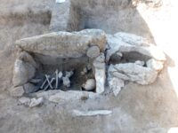 The burials from this period include a wide variety of funerary practices and tomb architecture. Tombs range in type from crouch burials in simple pit graves without furnishings to complex dry stone structures covered with mounds that housed the remains of several individuals. Several significant cist burials — chambers with vertical slab walls topped by massive stone slabs — were found with ceramic grave goods. Some of the stone funerary architecture is very subtle, like one large stone placed on its edge at the head of a grave.