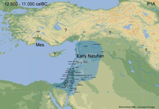 Natuferne, som er opphavet til de første jordbrukssamfunnene i Sørvest Asia, hadde trolig haplogruppe J, og representerer kanskje en ankomst av E1b1b, som vil si at de også hadde relasjon til Afrika. Dette på grunn av at de første farmerne i Sørvest Asia hadde afrikansk inflytelse. Genetiske linjer av afrikansk opprinnelse vil ha blitt båret inn i Europa med spredningen av jordbruk fra Sørvest Asia. En viktig migrasjon fra Afrika over Sinai oppsto i formasjonen av natuferne. Det er viktig her å ikke blande dette sammen med ankomsten av de semittiske språkene, noe som skyldtes en annen ekspansjon fra Afrika rundt 6000 f.vt. Men det kan forbindes med hva som er kjent med det gamle Europa og jordbrukets spredning, noe som ikke minst satte fart i etterkant av flommen som skyldte inn i Svartehavet rundt 6000 f.vt.